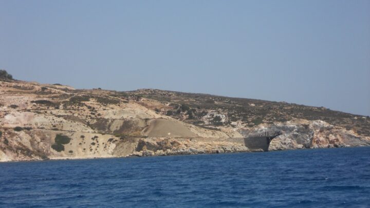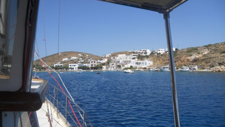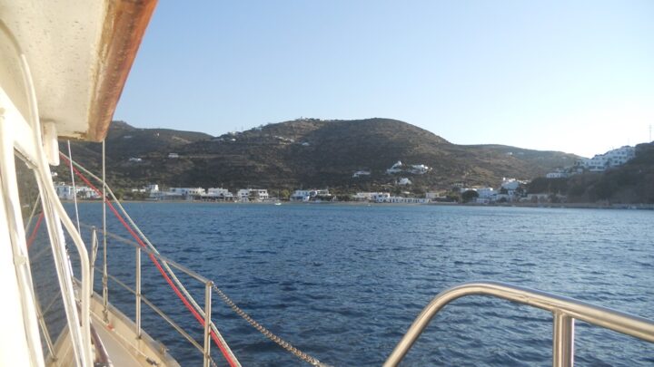 After a week in Milos we left the town quay and motored out of the long bay. We started heading East and our goal was to reach the island of Sifnos. It is many years since we had last been here. It was a question of motor sailing all the way. We sailed round Kimolos arrived in the early afternoon and after trying a first anchorage Ormos Faros (where the holding was bad) we eventually anchored in a big bay (Limeniskos Platy’s Gialos). We spent a peaceful night at anchor.