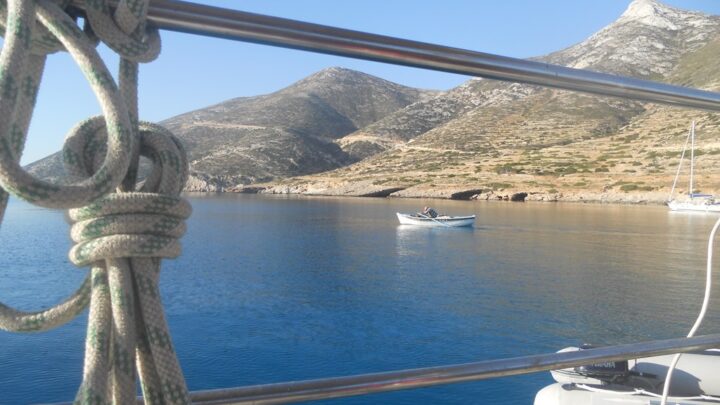 From Naxos we motored round the North tip of the island and headed for the island of Donouysa. The sea was calm and there was no wind. After 5 hours under engine we anchored in the beautiful bay all alone.