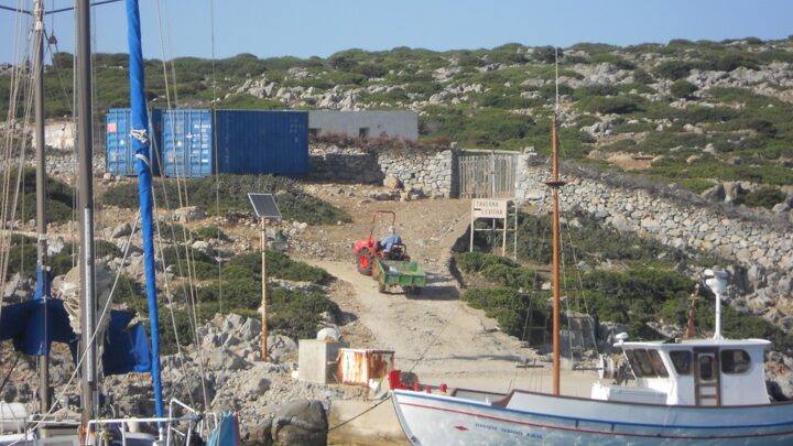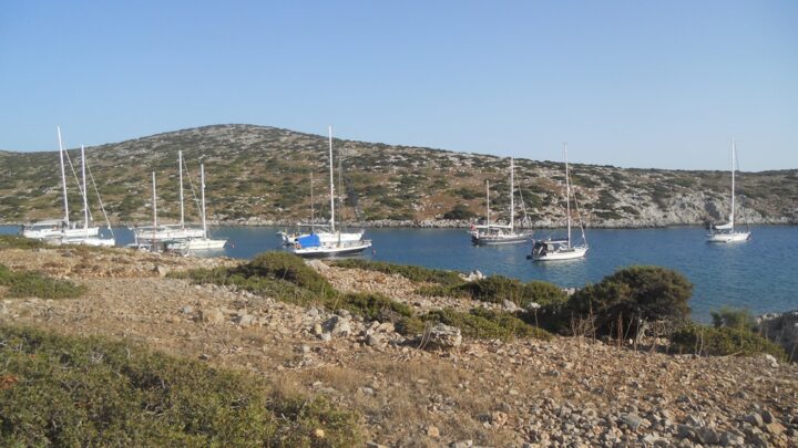 The next morning Svein went into the yard to collect our outboard and Cobra anchor that they were holding for us since the fire last year. With the anchor firmly in place (we were not happy with the anchor on the boat) and the outboard fixed to the stern we were ready to make our way down to Lakki marina. We were a little hesitant about revisiting the scene of the “crime” but we had some bikes to deliver. We had an extremely bumpy trip down the coast but eventually moored in Lakki marina and delivered the bikes to Pauline and Gordon (Crazy Dream). After a welcome anchor dram we arranged to meet up for dinner at our favourite gyro restaurant. A lazy afternoon snoozing and catching up on emails and phone calls we met and had a good meal.