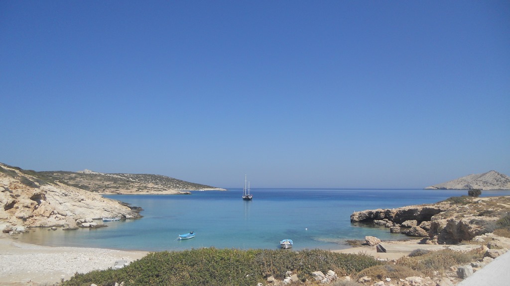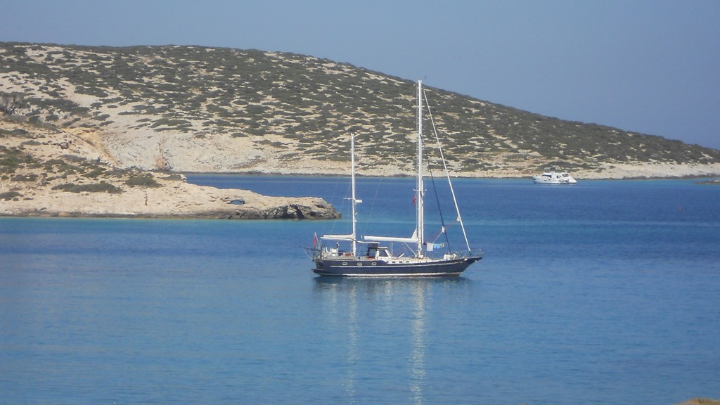 From Naxos we motored round the North tip of the island and headed for the island of Donouysa. The sea was calm and there was no wind. After 5 hours under engine we anchored in the beautiful bay all alone.