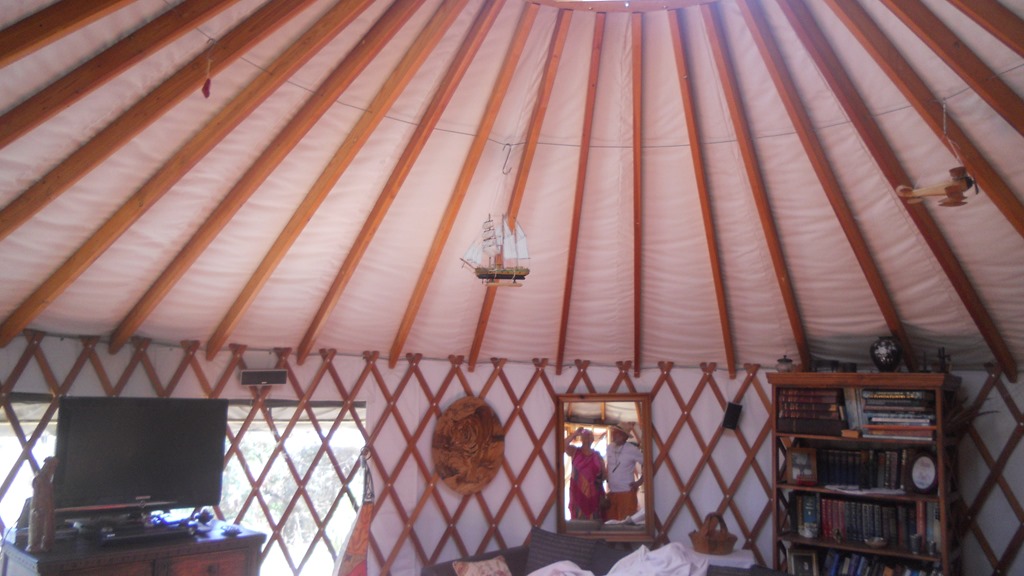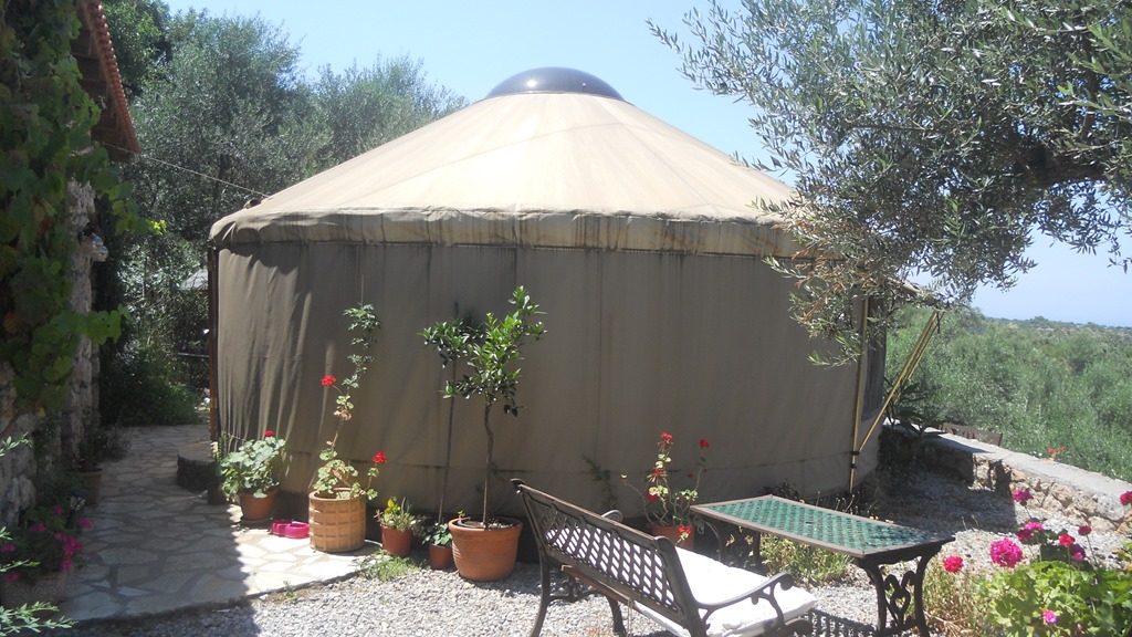 We had a delicious lunch with Annette and Jean Marie who were joined by Di. Before lunch we drove up to her “house” as she, in fact, lives in a Yurt. High on a hill top with a wonderful view over Kalamata bay this is a magnificent setting. The plot houses 4 yurts together with a kitchen building and another for the bathroom. It is surrounding by olive groves and flowers in blossom everywhere. It is ecologically sustainable with solar panels, generator and rainwater. What a fantastic idea for a home.