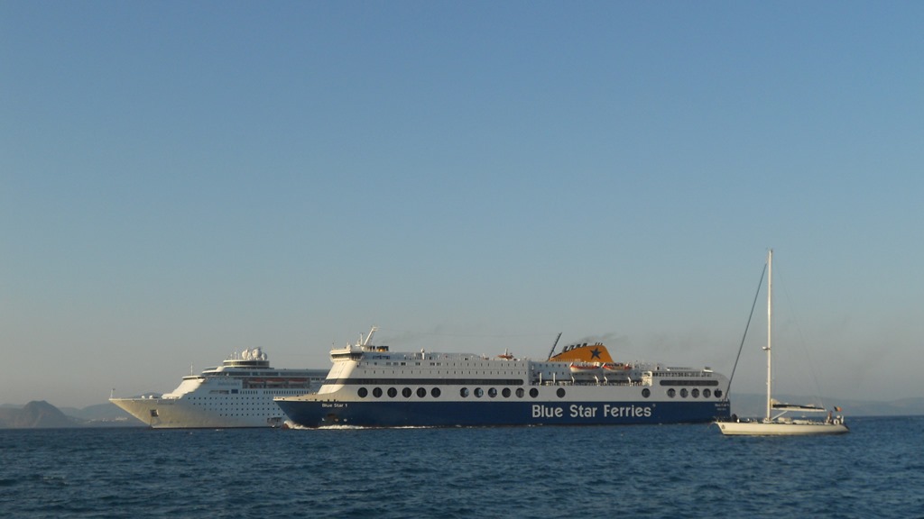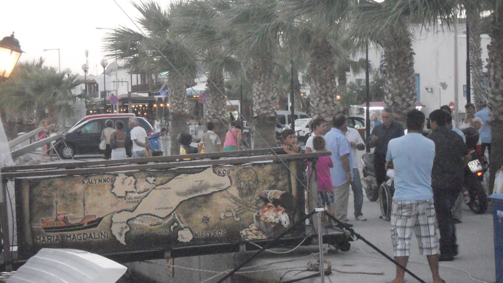 Time to move on so we left Pali and took the long trek (2 hours) over to Kardamena where we had organised the work to be done to change the fridge compressor. We managed to choose the hottest week of the summer to be at quay in amongst the concrete. Fortunately the sea was not too far away and we were able to cool down fairly regularly. There is plenty going on in the harbour with tourists wandering along the quay and the day tripper boats going out on their excursions packed to the gills. We also watched a wedding party boarding a “pirate ship” for an evening cruise.