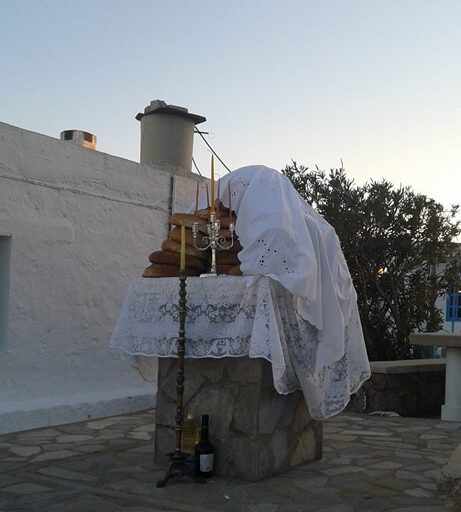 We also had time to enjoy the beach (every day) and a few saintly celebrations. The first was in St. Stavros church. This was reached by driving up the mountain road, down and across the equator and then up a dirt track on the other side. We were taken there by bus but it did not help that our neighbour was constantly making the sign of the cross during the whole journey! As usual there was free food (Greek salad followed by goat) and the drinks were paid for.