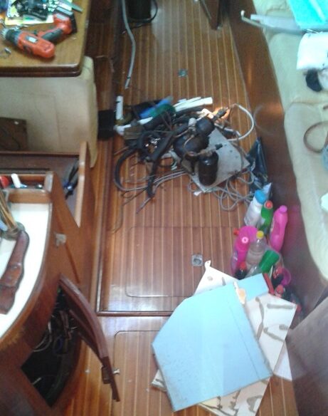 Although we have been partying at night Svein has been busy solving the fridge problem. The final solution was to remove the old system by taking out the compressor and the cooling element (50 kgs) and installing a 12v fridge that Mike kindly gave us. This is now in place and in addition our other 12v fridge has been installed under the saloon seat (in the place of the compressor). The latter one we can use as a freezer if necessary. Hey presto our consumption problem has been solved. He has also been helping Mike and Dimitri (the harbour master) to park boats and unravel crossed anchors. Our dinghy has been a godsend to them. He has also rewired the aft navigation light and reinforced the floor in the galley so all in all our time here has not been wasted.