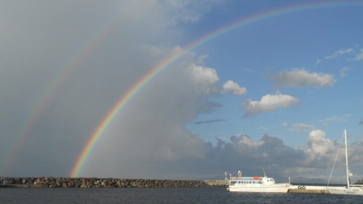We should be moving on soon but we must first wait out the strong blast that is forecast. The first sign of its arrival was the rain that came last night and again during the day today. It was cold enough that we had to get out our new sweaters. However we were treated to a fantastic rainbow over the harbour.