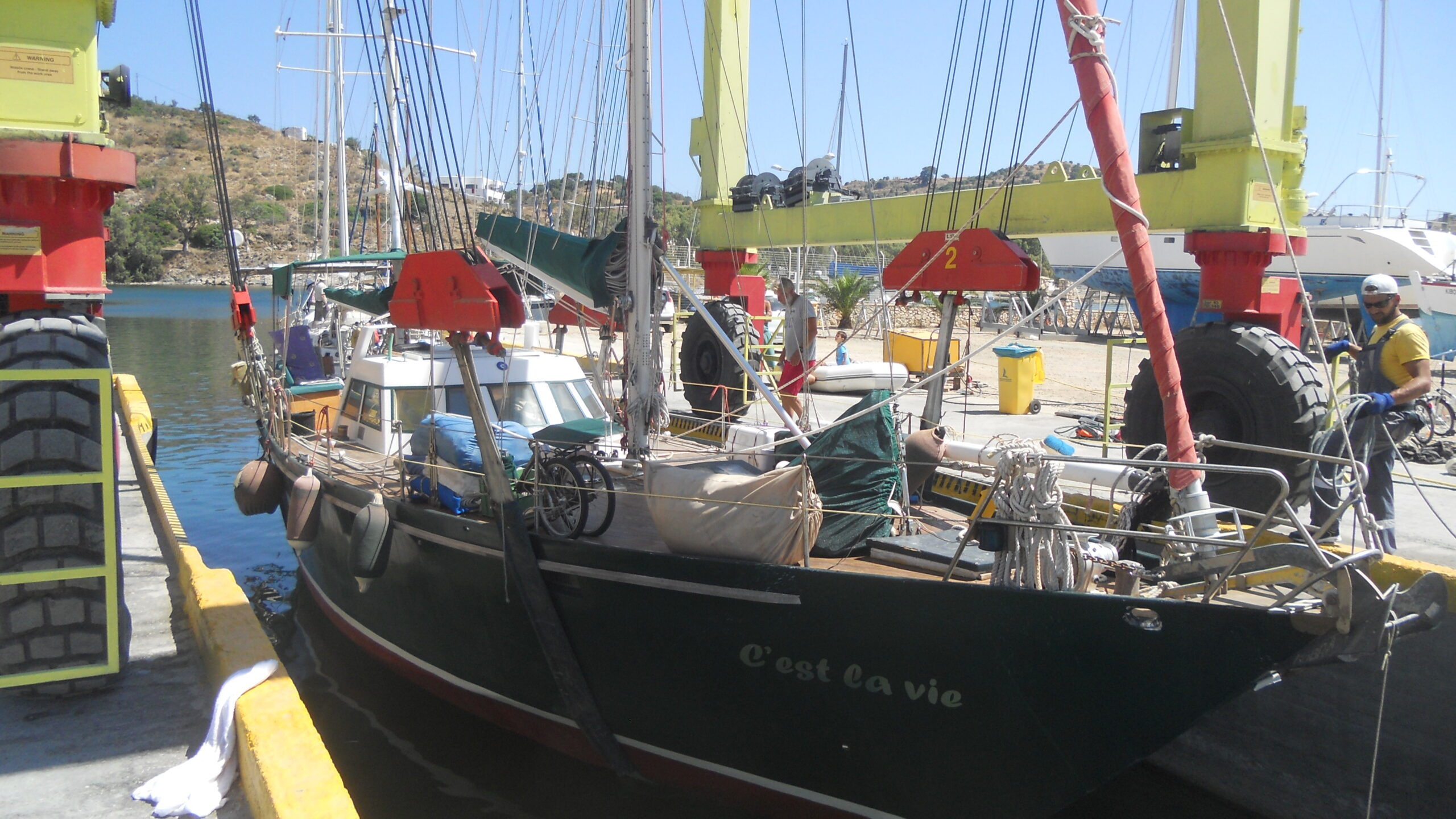 We got a very good offer so decided to take the boat out on land for 3 days to antifoul and check her over. All went according to plan and on 5th July we launched her at 11h15. By 12 noon we were out at anchor in the bay and we left her to go ashore to visit the island by car with Jespan. We waited for them to arrive with the car and about 13h00 we started off.