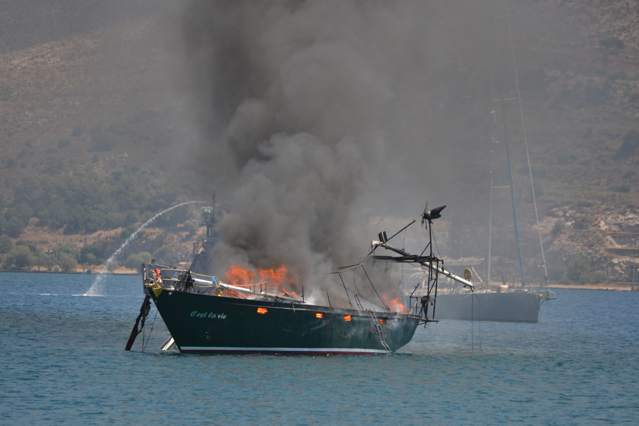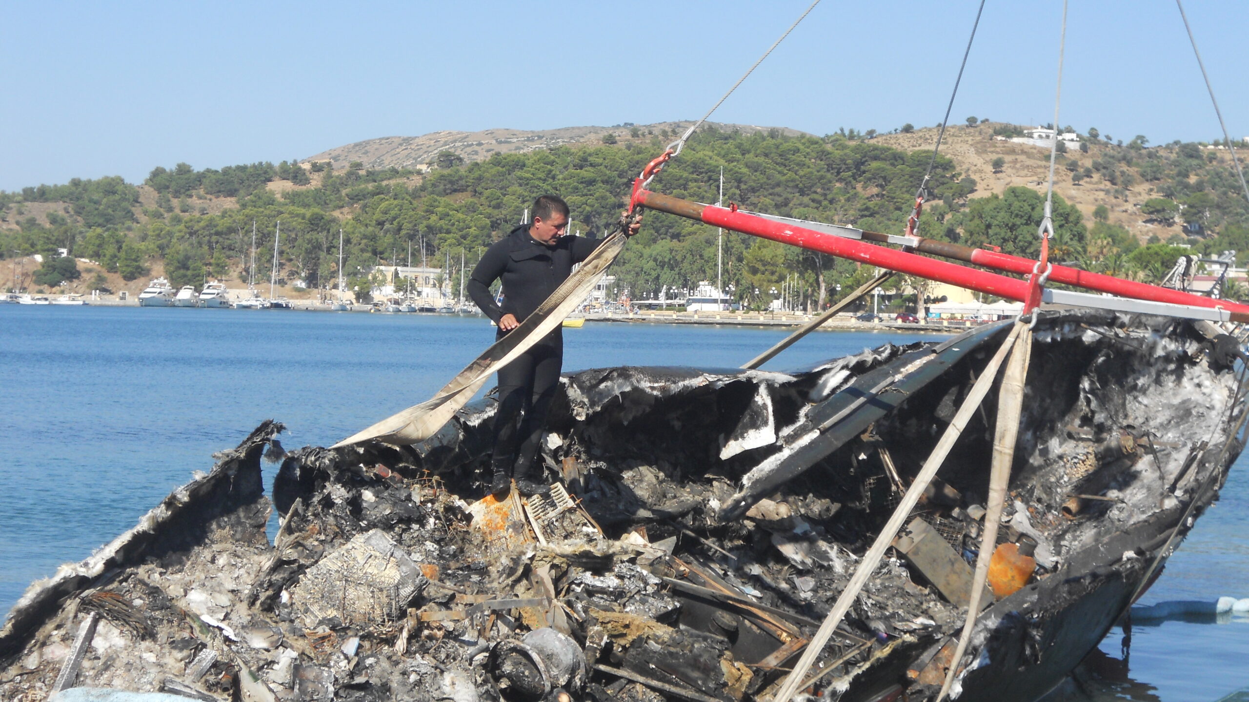 Everyone was fantastic. Jespan lodged us on the boat and Crazy Dream gave us clothes and other essentials. People in the marina and elsewhere came with clothes and other items to help us out. Svein to and froed between the Port Police and the marina to try to sort out what would happen next as we did not want her to sink and cause further problems. Unfortunately there was little help from the official authorities but in the evening friends rallied round and with our dinghy and another one she was pulled aground into shallow waters (still burning). Eventually a military fire vehicle with foam appeared and Svein took them out to the wreck to extinguish the remaining flames. It still took them one hour and by now we were nearly 20h00. After much hassle an anti-pollution barrier was placed round the wreck and then began the fight to get her on land. After nearly one week we were finally able to have the wreck brought ashore. She is now being broken down in a yard in the north of the island.